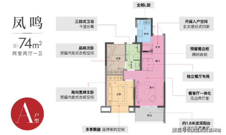 A1户型 | 2室2厅1卫 | 建筑面积约74㎡