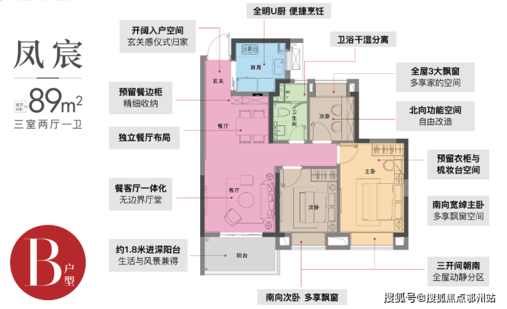 B1户型 | 3室2厅1卫 | 建筑面积约89㎡