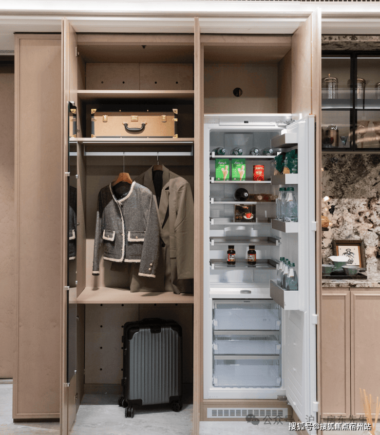 进门还设置一整排收纳柜,衣服、鞋子、行李箱等各种家用物品统统安排妥帖。