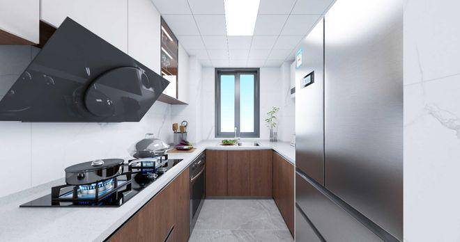 厨房为U型布局,配置定制橱柜、老板烟灶、林内热水器,台面为人造石,水槽为邦克台下盆,细节处体现人性化考量。