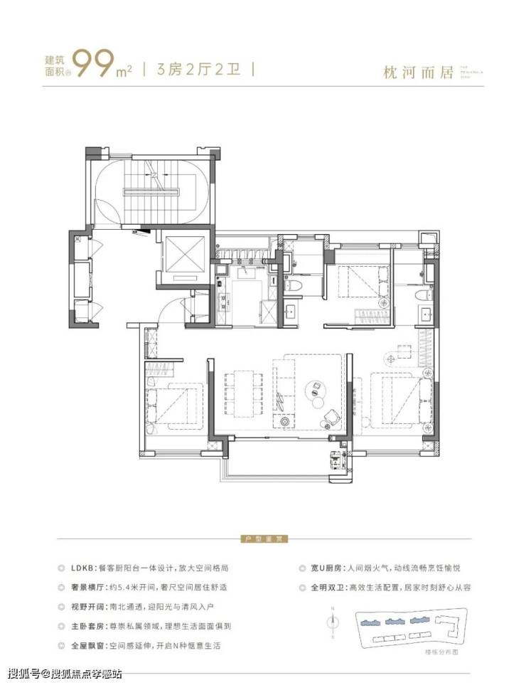 建面约99㎡滨水高层户型方正,功能性与尺度感兼得,在保证采光的同时,呈现开阔的空间场景。