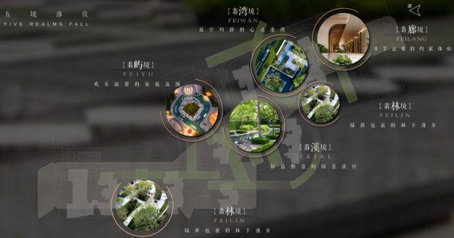 规划了 “翡色五境”五大空间氛围, 匠造融入时光、人文海派、自然与艺术、家庭与邻里的 “四轴、三园、五区、一所 ”四大功能空间。