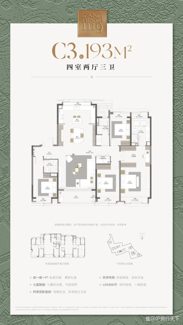 193㎡四房:设有双主卧,全屋飘窗赠送面积达20.7㎡(含主卫),尺度媲美别墅。配备英式管家服务,电梯厅可直达户内,并采用嘉格纳厨电、德国美诺洗衣套装,尽显奢华品质。