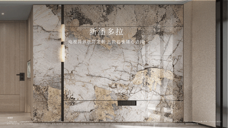 现在开发商都在卷奢材,保利天奕更是卷到天际,充分考虑业主的个性化需求,在电视背景板提供了新潘多拉、云中翡翠、弗朗明戈金三种结晶釉面岩板选择,成本更高,施工难度也更大