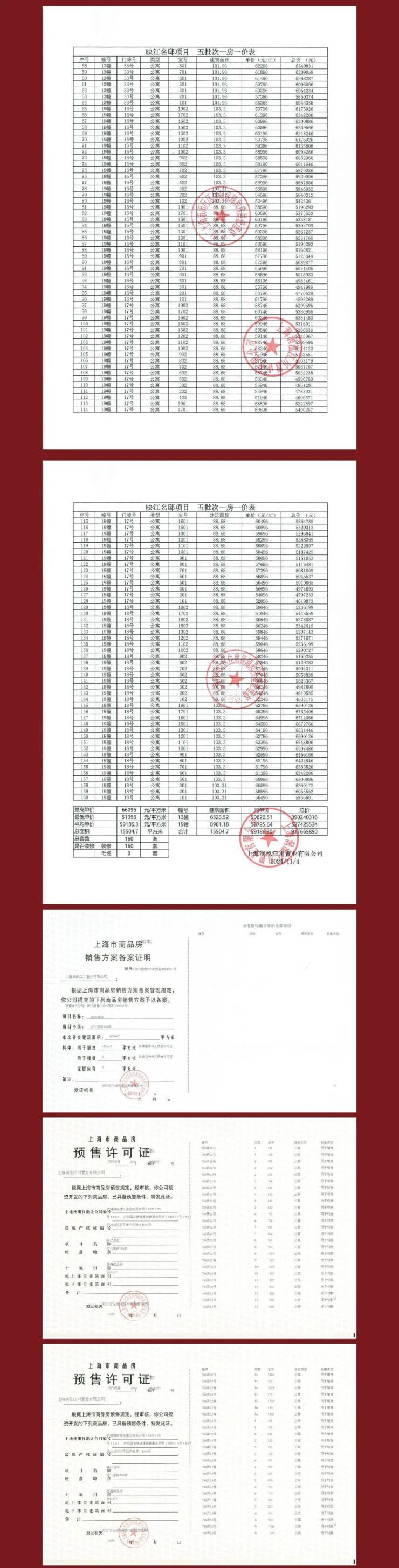本资料为要约邀请,不作为要约或承诺,项目具体信息以政府最终审批文件为准; 项目周围环境、交通及其他公共设施的效果示意以实际落成或政府部门标准文件为准。 有关学区划分根据政府部门当年的划分为准,不作 为开发商的任何承诺。 相关宣传内容不排除因政府规划、规定及分期规划、未能控制等原因发生变化,在不违反法律法规、合同约定前提下,本公司有权对该宣传资料细节进行调整或更新。 预售证号: 闵行房管(2024)预字0000120号、闵行房管(2024)预字0000164号、闵行房管(2024)预字0000232号、闵行房管(2024)预字0000269号、闵行房管(2024)预字0000351号。 制作日期: 2024年11月19日。 开发商: 上海润泓江川置业有限公司; 备案名: 映江名邸 ; 营销推广名: 映江润府