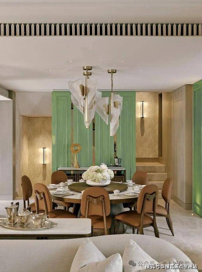 士林润园售楼处电话400-8787-740☑️☑️餐厅的设计巧妙融合了老上海的经典元素,圆形餐桌和橘色皮质餐椅在色彩上既现代又充满活力,顶部的水晶吊灯造型灵感来自上海市花“玉兰花”,既增添了空间的华丽感,又巧妙地融入了上海的地域特色。士林润园售楼处电话400-8787-740☑️☑️