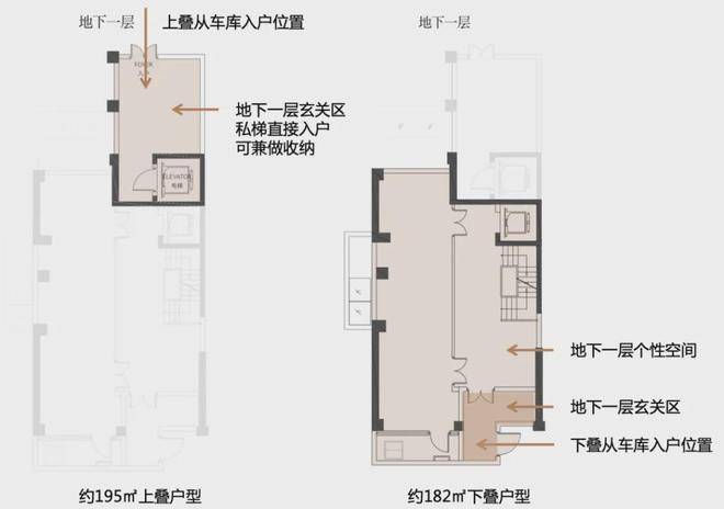 每套叠墅均有地库直接归家动线。无论是上叠还是下叠,都在地下一层有独立专属门厅,且面积不小。