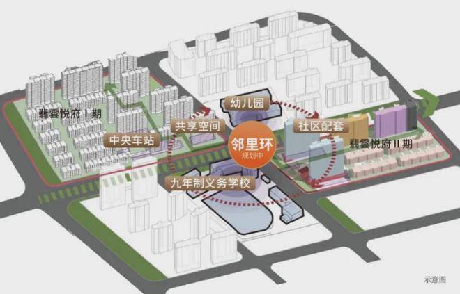 二期与一期对角互动,拥有幼儿园、共享空间、社区配套、九年制义务学校等配套空间,将这些“生活必需品”浓缩到5mins邻里环中,距离够近,才称得上便利。