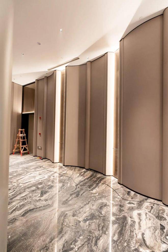 同时,大堂墙面全部采用定制弧面铝板,大理石拼花地面与整体大理石幕墙纵贯天地。