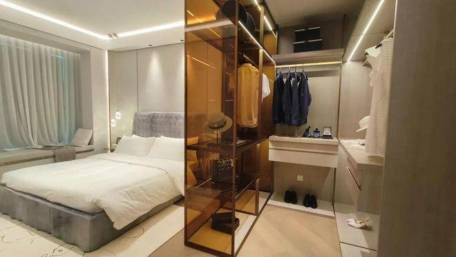 主卧套房设计,卫浴、衣帽间、主卧层层递进,卫浴还是全明设计,既有空间的尺度感,又有生活的舒适性。