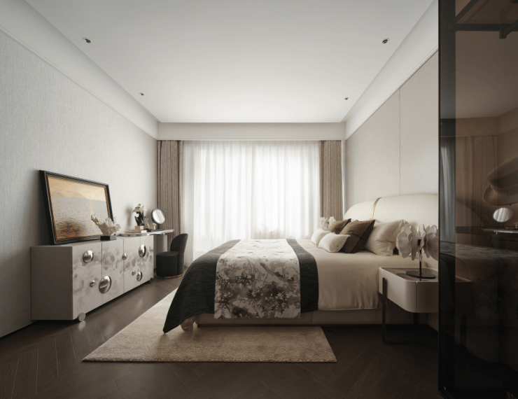 客厅面宽达到约4.2m,空间感和舒适度拉高了一个档次。项目还创新性采用"岩板隐形门"设计,将次卧入口完美融入电视背景墙,呈现极简主义的空间美学。