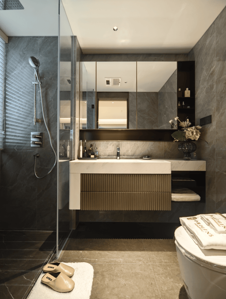 再来看主卧,主卧的面积达到将近20平米,尺度非常充裕。主卫也用了大量的岩板,配备德国唯宝卫浴系统,预留美妆冰箱改造空间的设计,细腻考量。