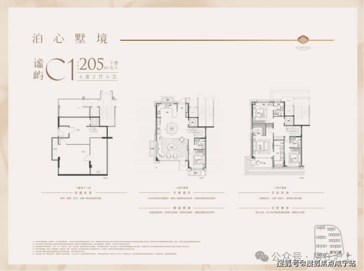 户型特点:下叠边套,南向面宽约9米,客餐厅同宽约5.8米,空间开阔。一楼设南向卧室,采光好且视野佳。二楼为三套房+主卧总统套房设计,主卫南向,可容纳浴缸和双台盆。地下室方正,附赠采光井,利用率高。