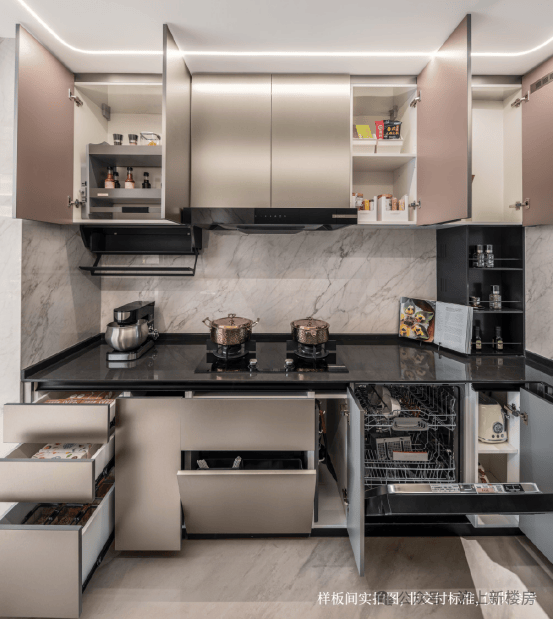 建发海宸打造了超容量橱柜,以更丰富的立体收纳空间,让空间化繁为简、化整为零,配齐吊柜拉篮、双侧台面调料柜、餐具与厨具收纳等,确保做菜时随手能拿到想要的调料,真正做到藏纳有道,拿放有序。