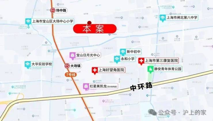 项目位于宝山区大场板块,地处界华路和场中路交界处,位置十分优越,距离7号线场中路地铁站步行最多也就500米左右,然后沿着7号线,两站入中环,三站进市区,六站就进入核心内环了。