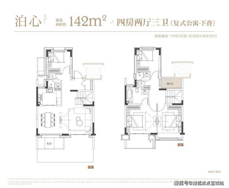 叠墅:叠墅一共四层,分为上/下叠,上叠建筑面积约139㎡,下叠建筑面积约142㎡。