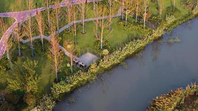 在社区打造上,项目以国际先进公园住区理念打造,向城市让渡开放空间,凭借前街后河的布局、代建约12000㎡滨水公园的规划,打造出「外揽城市绿肺,内藏森境天地」的居住体验,让繁华都市与静谧生活自然过渡。