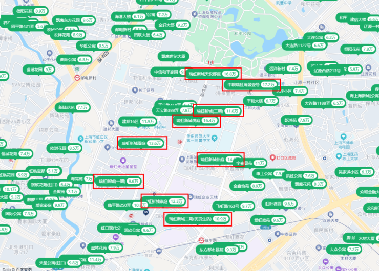 再看二手房,瑞虹新城板块次新房挂牌均价在10-18万/㎡不等,整体上越新的房子越贵,比如瑞虹6789期目前挂牌普遍在15-18万/㎡。