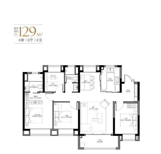 产品:103㎡、107㎡的三房两厅两卫及123㎡、129㎡的四房两厅两卫