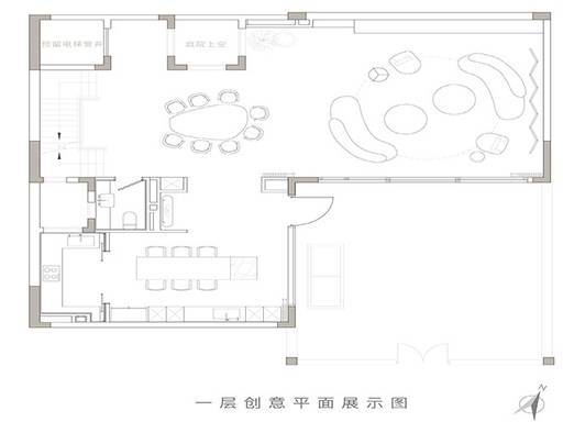 一层:3.6 米层高,无主灯设计,隐藏式收纳系统,L 型合院布局围合出私家庭院,风雨连廊串联各功能区。
