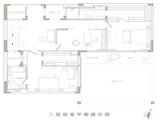 二层:双套房(均带独立卫浴)+ 体育厅 / 书房,其中一间卧室带露台。