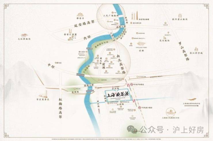 上海桃花源的择址,与传统市中心人民广场在南北中轴线上,由济阳路快速路、中环、外环以及各大隧桥快速连通市区,这是项目出则繁华的基础。