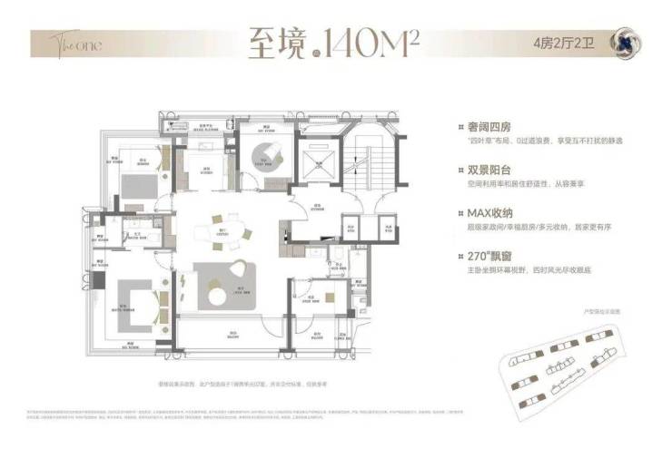 140平4房2卫生户型升级了空间和装标,采用利用率更高的四叶草布局,整体南向面宽达到约14米,南北双270度视野采光很充足。