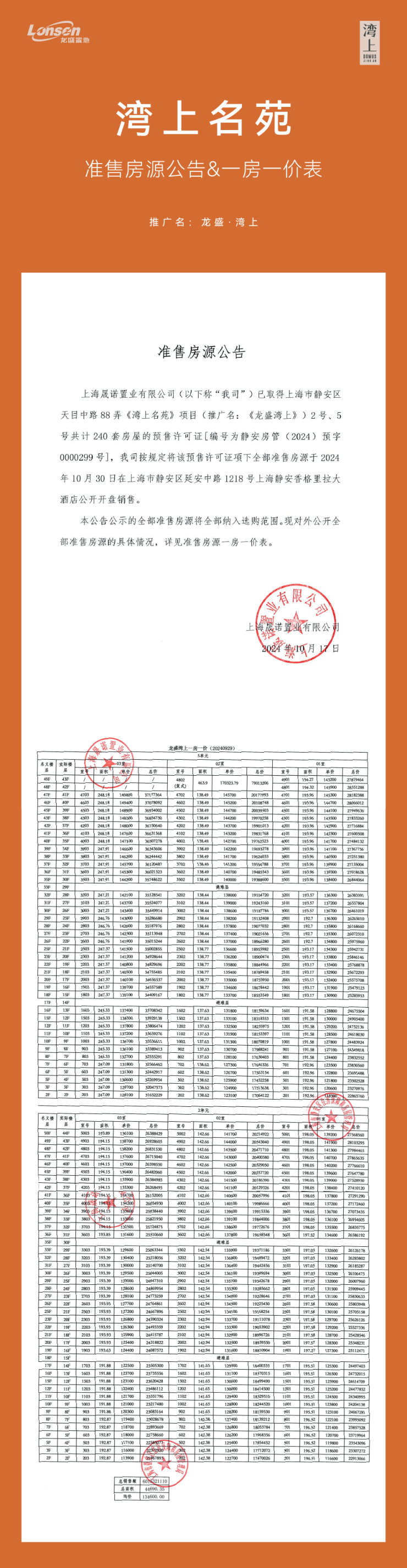 住宅项目推广名:龙盛·湾上 备案名:湾上名苑 开发商:上海晟诺置业有限公司。商品房预售证号:静安房管(2024)预字0000118号,静安房管(2024)预字0000204号,静安房管(2024)预字0000299号。本资料仅作为本项目展示之用,涉及的图片及文字描述等旨在提供相关参考,不作为要约、承诺或者实际交付标准,相关内容不排除因政府相关规划、规定及本公司未能控制的原因而发生变化,最终与本项目相关的内容以商品房买卖合同及政府规划、相关法律规定为准。本公司若根据实际情况作出修改的,敬请留意最新资料。如有侵犯个人及组织权益,请告知龙盛置地集团资产管理部进行删除。
