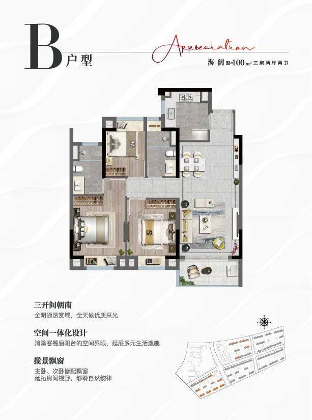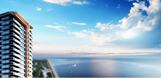 上实听海为打造国际化滨海城市新风貌,将海的DNA赋予项目各个维度;结合地块划分,让建筑呈现海的起伏韵律,形成高低有致的天际线;建筑立面犹如风帆造型,叠加海弧线元素,现代感雕塑品质感,呈现海的美学艺著,以海韵与扬帆的界面,与绵延的海岸线形成视觉呼应。