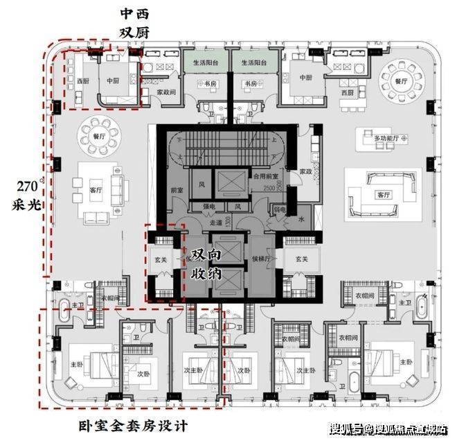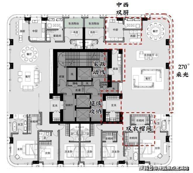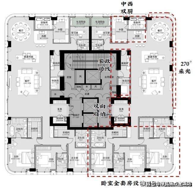 目阶段性户型过程稿,仅供参考针对高净值客户,私密性显然是最重要的。电梯双开门设计,家政服务人员也有单独出入动线,尽可能减少对业主的影响。超80%的得房率,LDK一体化厅+西厨岛台,L型大面积转角落地窗,呈现出270度的幕布视野,这个王者公区的尺度不到现场来看,根本是你想象不到的震撼!