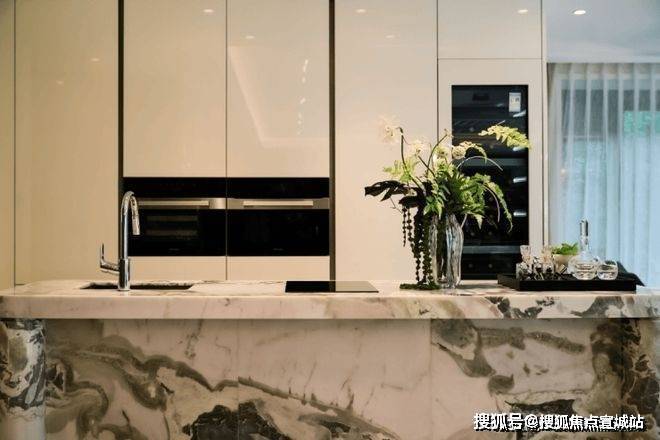 这次新开的建面约315㎡样板间由LSD大师设计团队,在装修方面可谓诚意满满,从地面到墙面到壁龛都是石材,提升居住整体的格调,配置了十件套厨房家电,甚至酒柜!