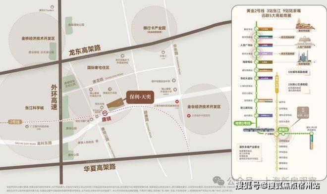 交通方面,该地块算是唐镇地铁上盖项目,与2号线唐镇站直线距离约200米,南侧紧贴着高科东路。通过2号线,2站金科路站,3站张江高科站,9站陆家嘴。