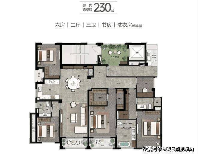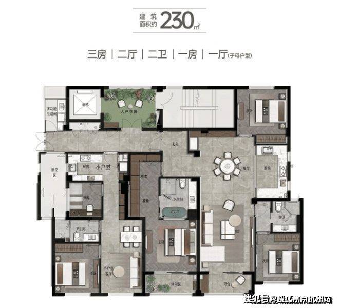 稀缺4+2户型,满足一生之宅230㎡子母户型3房2厅2卫/1房1厅1卫▼一大一小,既要“大家庭”的其乐融融,又要“小家化”的私密空间