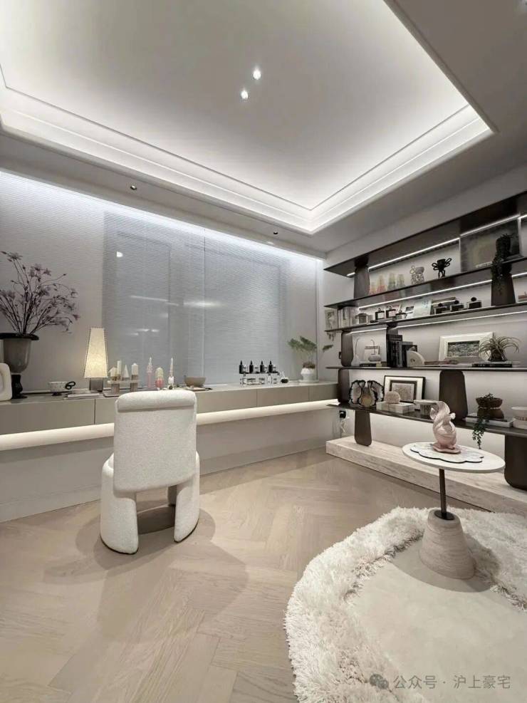 比如,弧形、奢石与灯光等相得益彰且设计感满满的架空层。