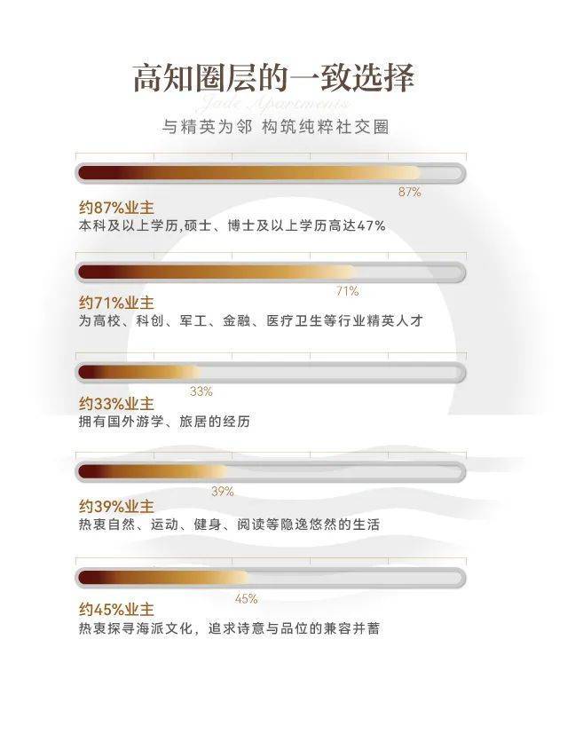 据统计,映江润府业主约87%为本科及以上学历,硕士、博士及以上学历高达47%!千金买房,万金买邻,像映江润府这样高比例的高知住区全市少有,而对于年轻的城市菁英们来说,无形的圈层代表着对社会资源的占有,决定着人生的高度。