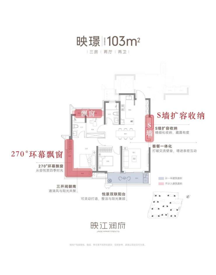 再来看采光视野无敌的建面约103㎡3房2卫边套户型:
