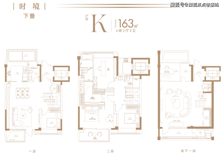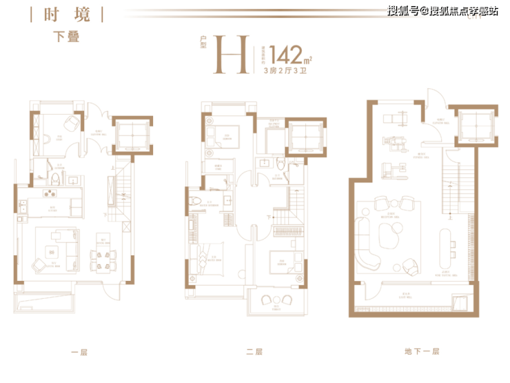 以建面约142㎡下叠为例,地上两层、地下一层阔绰空间,动静科学布局,全面考量三代同堂与二胎家庭的居住空间需求,以人性化质感空间演绎舒奢生活。