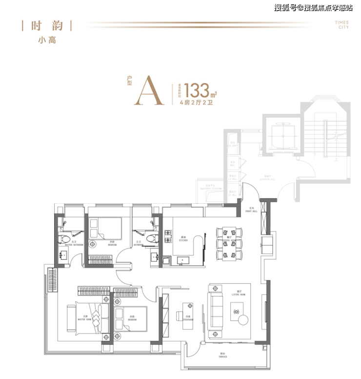 建面约133㎡4房(小高)约5.9m大面宽大横厅+主卧270°转角窗