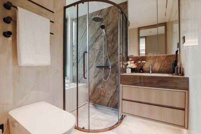 同时卫生间配有杜拉维特的面盆、汉斯格雅的龙头+五金、AO史密斯燃气热水器、杜拉维特智能马桶(建面约139㎡户型)、恩仕智能马桶(建面约110㎡户型)等国际一线大牌,这个标准放到南大甚至是整个中环沿线,都是顶配级别。