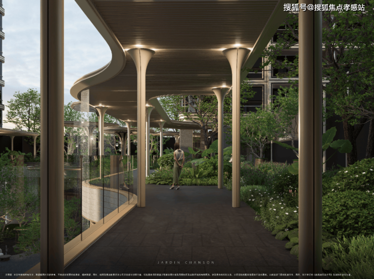 项目也采用当下豪宅新盘才运用的风雨连廊,打造风雨无阻的归家体验的同时,也连接着社区核心景观节点和功能空间,大大增加小区景观的空间体验。