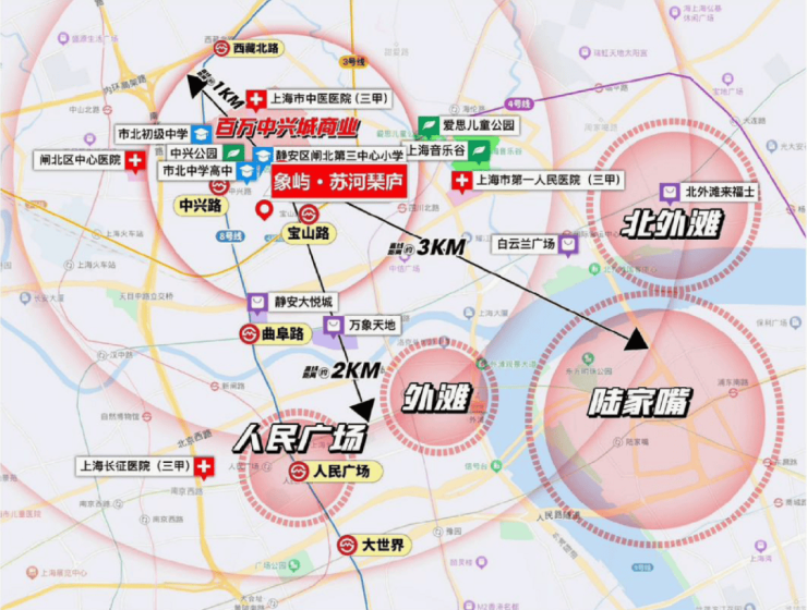 【商业】直线约300米可达中兴公园和交通公园,距静安大悦城、万象天地、宝格丽酒店、苏河湾世界级滨水商务区等配套直线约1KM,距人民广场直线约1.5KM,周边聚集了超21家跨国公司地区总部,约3KM国际生活圈,涵盖陆家嘴、人民广场、静安寺、南京路、外滩、新天地等繁华CBD都市生活圈。