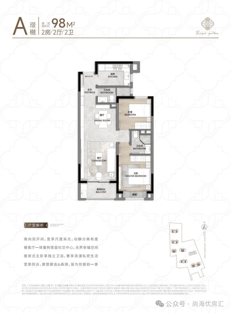 建面约94-100㎡的两房A户型是千万总价入主静安内环的理想之选,最高超79%的得房率,室内几乎没有走廊等空间浪费;动静分离,主卧套房设计,配独立卫浴间,居住舒适;次卧功能定位多样,可做多功能儿童房、书房、工作室、电竞房等等;阳台尺度宽适,增加实用空间的同时,还可为宠物设计一处梦想乐园。