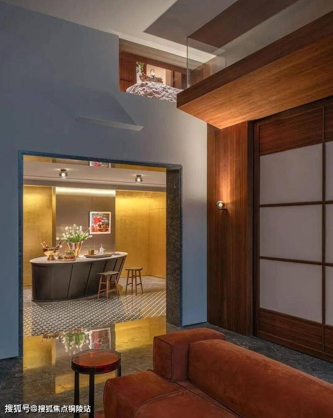 在“木屋”后方,是一个墙面和天花板都覆盖金箔的“水吧”。在这里,我们重新引入了一些当代西方设计语言——大理石地面图案、蛋形吧台和墙面护板细节。这些元素与醒目的红色高光烤漆柜相互平衡。