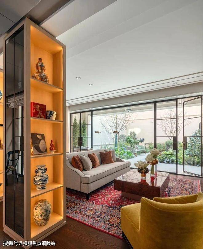在客厅中,两个展示架巧妙地将空间分隔成主客厅区和休闲室,营造出一个与建筑尺度交相辉映的层次空间。