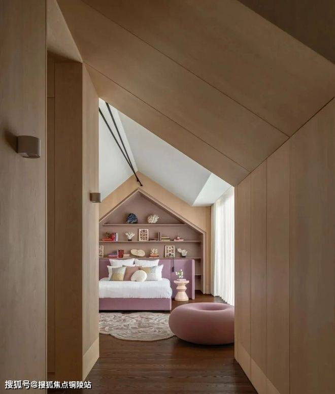 四层阁楼是大女儿的卧室。这里的斜顶启发我们在空间内打造了一个木质小屋;配备私人浴室和衣帽间,还有一个露天阳台,仿佛这充满阳光的一层就是个独立公寓。