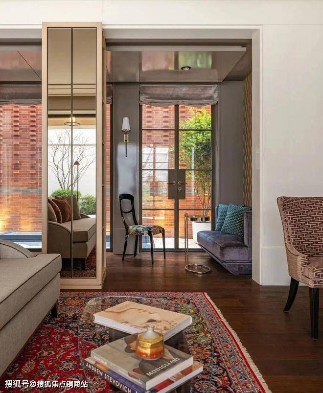 从庭院地面层,可以看到客厅和餐厅的内部空间。客厅在立面上向内凹陷,形成了一条有遮盖的走廊,通向房屋定制的深铜色入户大门。