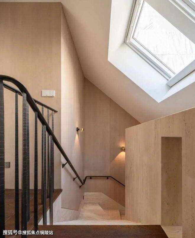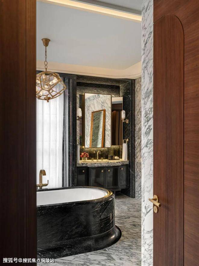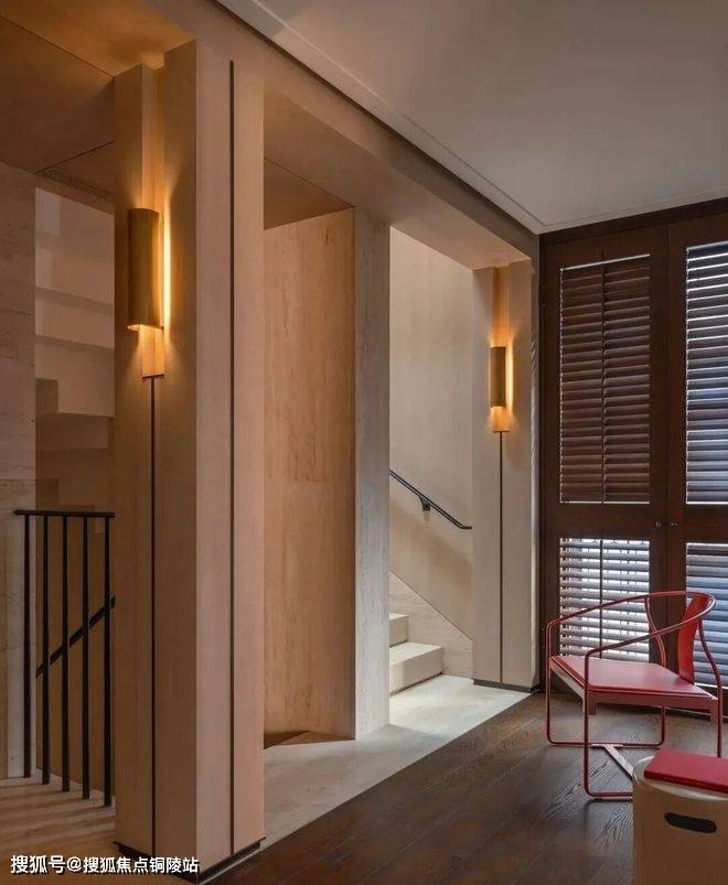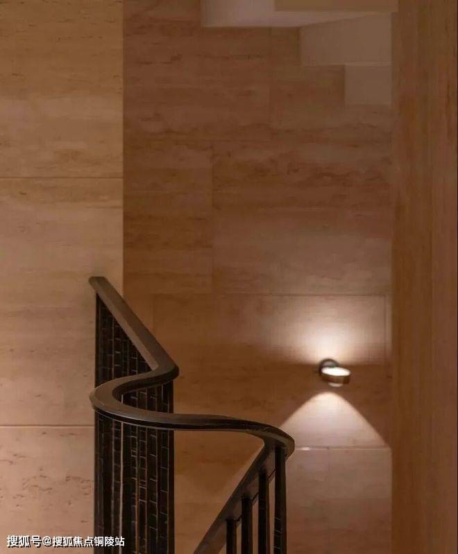 深铜色的栏杆和扶手融合传统与现代语汇,演变出一种当代型态,与现代白色洞石相映成趣,营造出优雅纯粹的意境。