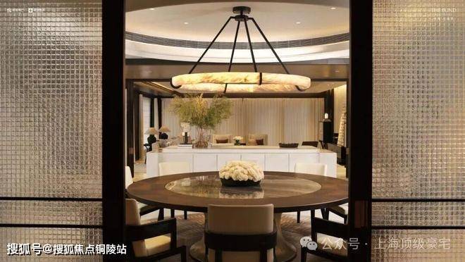 约270度三面环幕式开窗,打通阳台、客厅、餐厅与厨房,形成约19.1米南向与22.1米东向的超宽视野面宽。空间如画轴展开,面朝陆家嘴天际线,营造如剧场般的奢阔视觉感受。