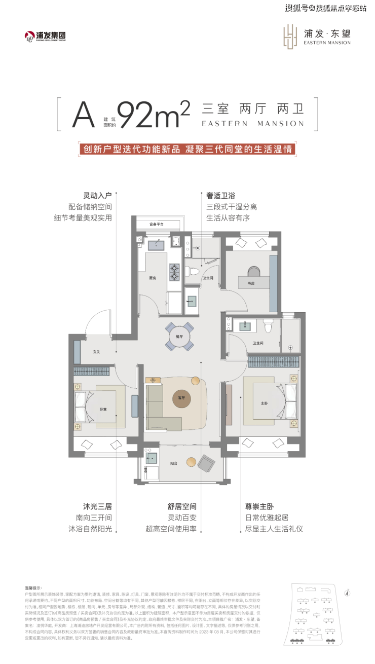 建面约92㎡3房产品市面上大多都是1卫的设计,但浦发东望为2卫的设计,实用性超高的同时,空间也较为宽绰。