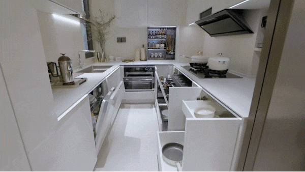 配合抽拉置物架、地柜联动拉篮、天使下拉拉篮、三重骑马柜、随心抽、窄柜高深拉篮的组合拳,每一种都像是为不同的物品量身定制。
